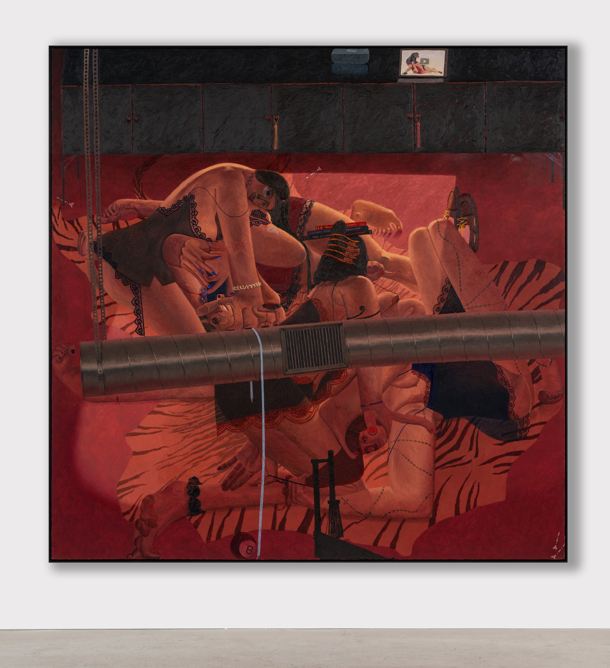 In ‘Den (2026)’ zet Celeste Rapone een intrigerend en gelaagd tafereel neer op groot formaat. De compositie wordt gekenmerkt door een vervreemdende, hoekige perspectiefopbouw die de ruimte als het ware samendrukt tot een fictieve, moeilijk te plaatsen omgeving. Onder een industriële ventilatiebuis ontvouwt zich een scène waarin vier vrouwelijke figuren, gehuld in sensuele nachtjaponnen, met elkaar verstrengeld raken.