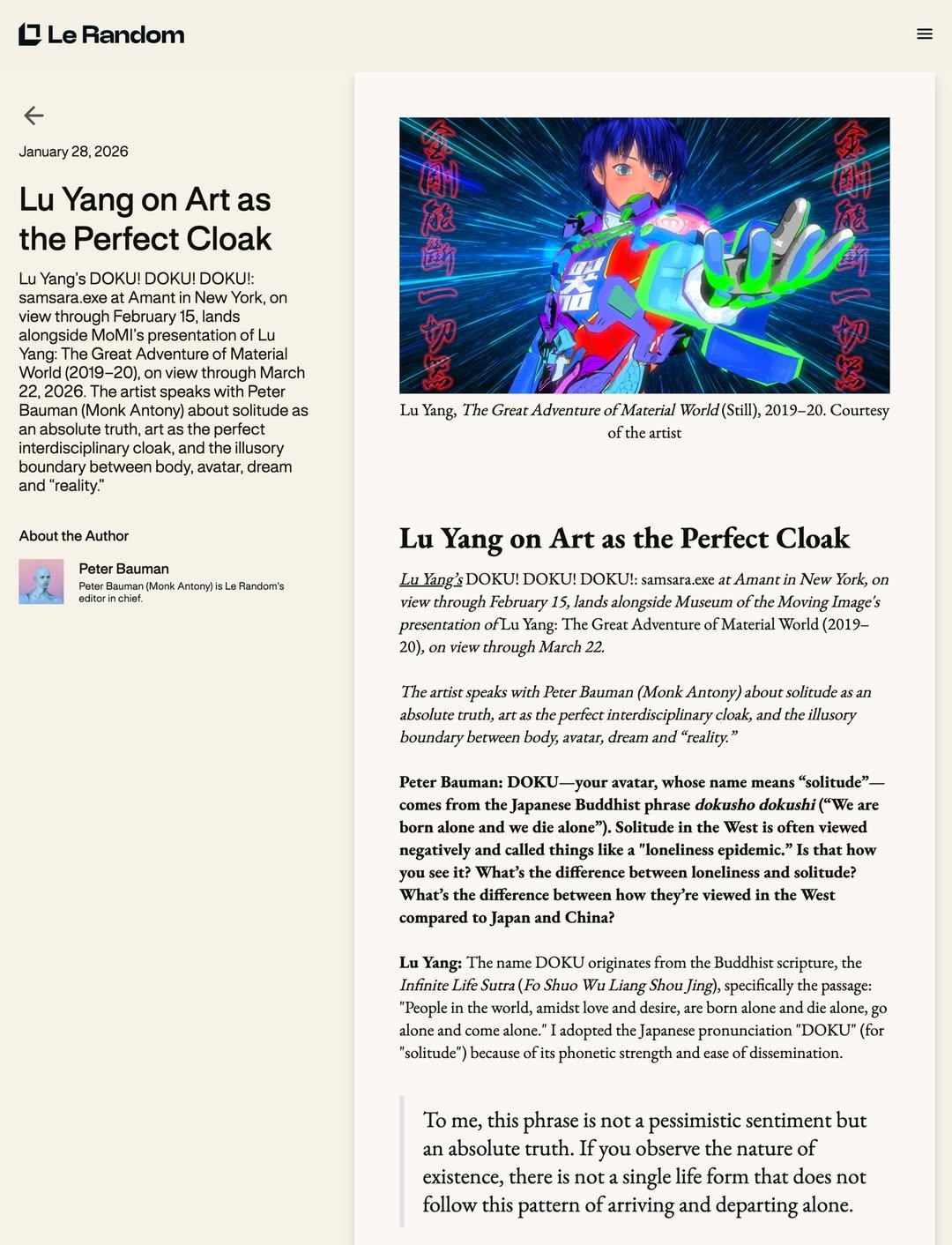 “Lu Yang on Art as the Perfect Cloak” @ Le Random, 28 januari 2026.