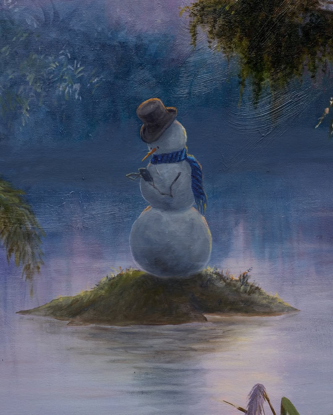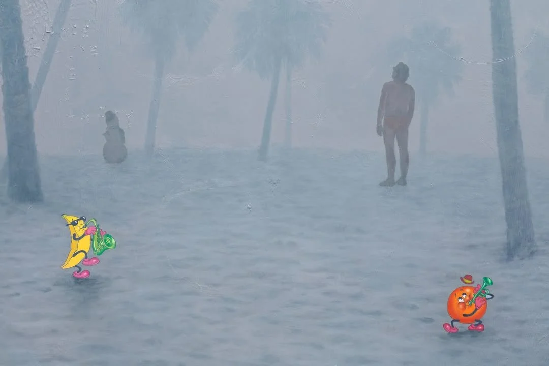De tentoonstelling opent met een afbeelding van een tropisch landschap. Het schilderij, getiteld ‘I Think I've Made It’, 2022-2026, toont een meer omgeven door weelderige vegetatie. Op humoristische wijze wordt de verwachting van de kijker op zijn kop gezet door een sneeuwpop die op een eilandje in het midden van het meer staat en een sms-bericht verstuurt.