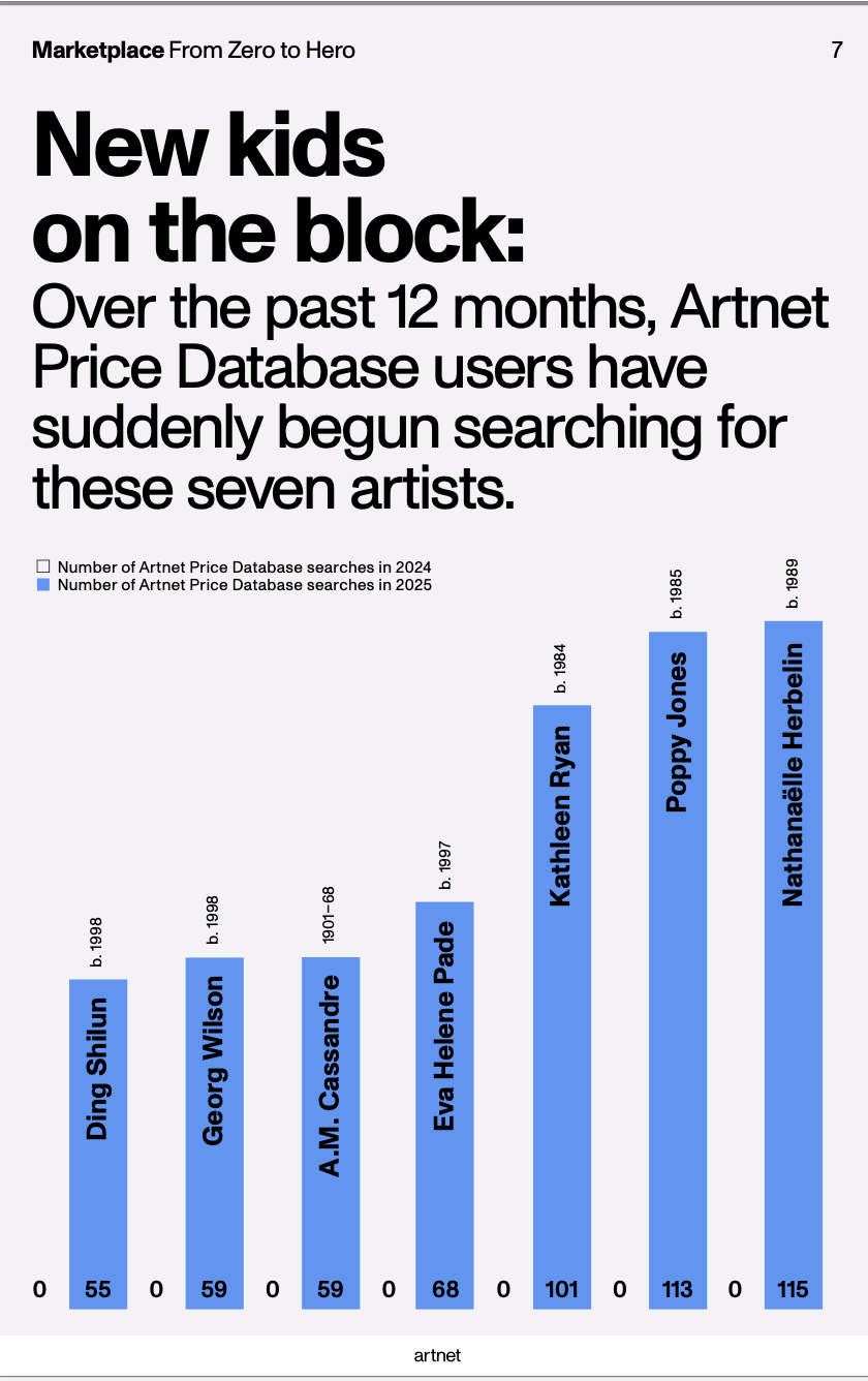 De afgelopen 12 maanden hebben gebruikers van de Artnet Price Database massaal gezocht naar een nieuwe lichting kunstenaars die razendsnel terrein winnen. Twee namen springen daarbij in het oog: Nathanaëlle Herbelin en Eva Helene Pade.